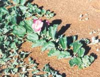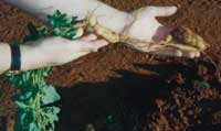 The root of Harpagophytum procumbens must be dried quickly without contamination from other plants or fungal spores and, in order not to decimate the possibility of future crops, only the storage roots which form in branches off the main root should be harvested. That way the plant goes on to provide another harvest the next year (see photo right). Traditionally, bushmen collecting the crop for local medicinal use would pull up the whole plant and discard whatever wasn't needed, which was not a problem when one was only providing sufficient root for local people. Now, though, Europe (mostly France and Germany) has a demand for Devil's Claw which pushed Namibian exports up to 600 tonnes a year by 1998… and rising. Without sustainable production methods the plant could become extinct.